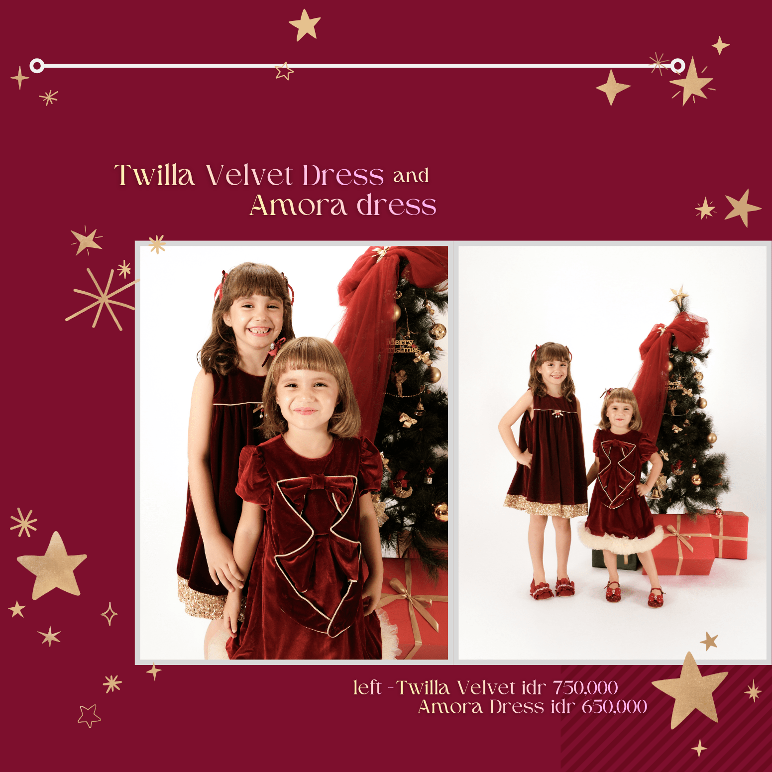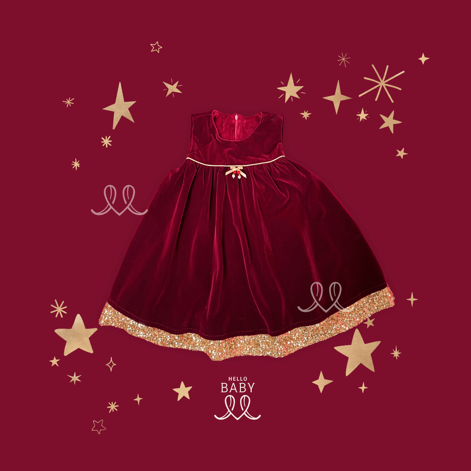 Rich maroon velvet dress with golden touch. Featuring gold ribbon detail and glitzy hemline — fully lined for comfort and cozy feel.